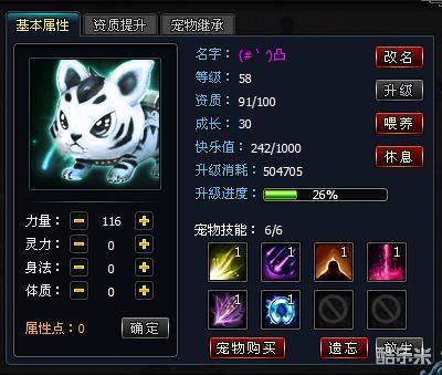 这个资质,在旧版中,就是决定一个宠物是否牛X的必备条件,也就是说,只要是资质够高,宠物就绝对牛X,资质越高,每一点的属性加成也会也高,就像我的这个宠物,116点的力量,可以增加422的攻击力,也就是说,平均没一点可以增加3.6的攻击。但是改版以后,我个人认为,资质只要到91就够了,这个是一个分水岭,90的资质是蓝色宠物,只能学4个技能,但是只要资质增加1点到了91,就可以学6个技能了,这个就是紫色宠物目前最让人喜爱的地方,估计以后还有橙色的宠物,可以学到8个技能,不过这个不知是多久之后才会出现了。