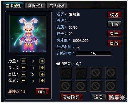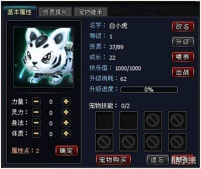 颜色为白色,初始资质是30,资质上限是90,成长是20.宠物技能栏是2个。资质上限90.
