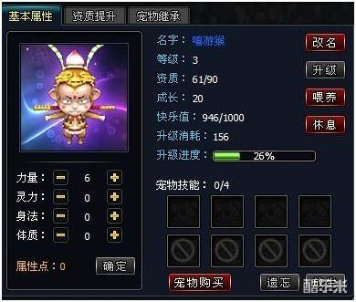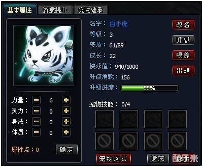 白金召唤出了的宠物资质是61,资质上限同样是90.从资质来看这个白金召唤比起普通召唤可说是有质的飞跃,也不贵,有条件必须买一个。虽然说成长是跟普通召唤一样的,但是别忘了,我们有宠物继承功能。捉个25成长左右的宠物是轻而易举的。下面是我随便捉的一只宠物。