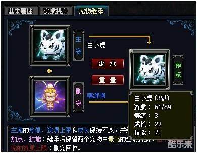 因为继承后,是会保留两个宠物中当前资质最高的一个。所以现在是保留了副宠白金宠物的61资质,等级,以及加点。同时获得了捕捉的宠物的资质上限以及成长值。