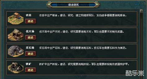 资源建筑包括农田、伐木场、采石场、铁矿。资源建筑为城池不断提供粮食、木材、石头、铁矿和资源,是你在游戏中快速发展的根本。城池的建设、军队的发展、战争的持续,都需要花费大量的资源。你必须尽可能提升资源建筑的等级,并训练大量的军队来保护敌人的破坏。