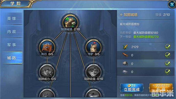 看过全部四大类科技,城防科技对学院的要求是比较高的,前期的存在感并不是非常的强烈,当主城达到10级以上时,它的舞台才渐渐浮现,平日里主君们的英雄队伍大多在外拼杀野怪或是采集资源,如果没有较高的城防作为依托,一旦外敌来袭,损失也是会相当的大,因此城防科技的重要性也是不言而喻。那么今天的内容就到这里,祝诸位主君武运昌隆!