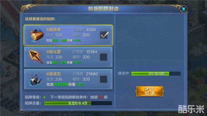 为什么在这里小臣只提出了研究滚石和滑木呢?原因其实很简单,第一,滚石陷阱是攻击所有兵种。虽然伤害百分比不如滑木和火箭,但是,滑木和火箭只能针对弓兵、法师、骑兵和步兵,对枪兵却伤害渺小,所以就算研究了滑木和火箭,也还是要学习滚石来提升对枪兵的伤害,如此一来,需要花费的时间就是三倍。第二,滚石和滑木两项科技是开启后续城防科技的必要条件,所以是必学的。在考虑时间因素的前提下,学习可对全兵种产生百分比伤害的滚石而弃火箭便成了必然。