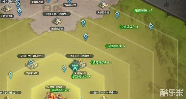 1.野外资源有划分等级刷新,等级越高的资源刷新分布越靠近中立地区。但是中立地区处于乱战地区,敌国城池可以使用高级迁城移动到主君城池旁边掠夺资源,所以想采集更多的资源可以加入一个较强的联盟协助在中立地区采集资源或者开着战争守护迁城到资源丰富地带去采集资源;要注意即使城池开了战争守护,采集资源点还是可以被攻打的,防守失败后会被打断采集,但已采集到的资源不会损失太多。