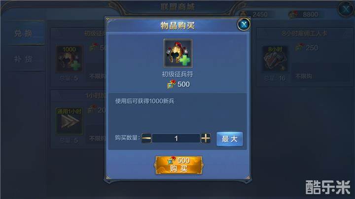 初级征兵符每个能够提供1000的新兵,可通过消耗500联盟贡献在联盟商店获取,是一种主要针对士兵前期(9级主城之前)消耗的道具。恰好主君主城达到9级后升级军营能够得到4阶兵,此时士兵激活技能战斗力可以说是前期最强,外出征战的不二时机。