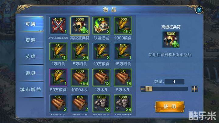 高级征兵符每个能够获得5000新兵,这在16级之后的后期中刚好是一个英雄的带兵量,所以他针对的是7阶兵以后的战争。由于士兵等阶的提升对于属性的提升几乎是翻倍,所以此时7阶兵的属性已经是极为恐怖,而且伴随着后期建筑升级资源的大量缺口,由资源引发的战火在大陆上已经是随处可见。