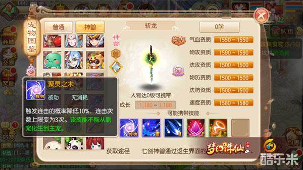 接着要聊的则是斩龙,因为在个人看来它的能力确实强悍:被动技“聚灵之术”让连击次数变为3次,虽然降低了少许触发概率,但整体效果还是增加了连击宠的输出量(在40%左右),并且增加连击次数不止有提伤这一效果!