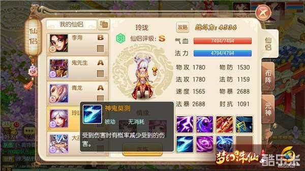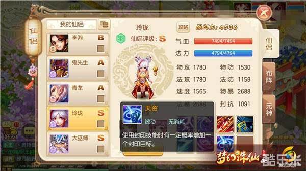 这几个技能是玲珑在仙侣中如此受欢迎的原因。因为在回合制游戏中“先出手永远比后出手要占据优势”。玲珑在“圣女”这个技能的增幅下可以说速度会达到一个非常恐怖的地步。“天资”这个技能虽然可以增加一个封印目标,虽然几率非常小,但是一旦成功可以为我方带来非常大的优势。在实战中基本上一开始就会先手封印敌方的目标,而玲珑则可以很好的达到这一条件。玲珑的免伤技能可以保证在战斗能有较大几率存活下来。最后小伙伴要注意的是仙侣的情缘也是可以对仙侣的属性有不小的加成哦!我们可以更具自己的阵容经行搭配。