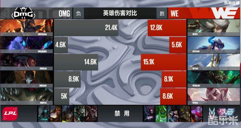 双方打野均是F6开,WE下路双人组帮拉打红buff。在比赛前期,WE凭借着线上的强势成功取得对线优势,在前期WE拿到了不错的领先。比赛进入转线期后,OMG几波打架节奏成功让己方核心小炮收到人头,快速的发育起来,OMG很好的将前期劣势扳回,双方陷入了较长时间的僵持。但WE有着更强的找机会能力,连续两波的偷打大龙,慢慢将经济差距拉大,并在小龙属性上取得了绝对的优势。在44分钟,WE利用双龙buff再度拿下OMG下路水晶,之后从上路果断的开团,将OMG团灭,霞在队友的帮助下拿到五杀。WE一波结束了比赛,拿下今日比赛的胜利,恭喜WE!