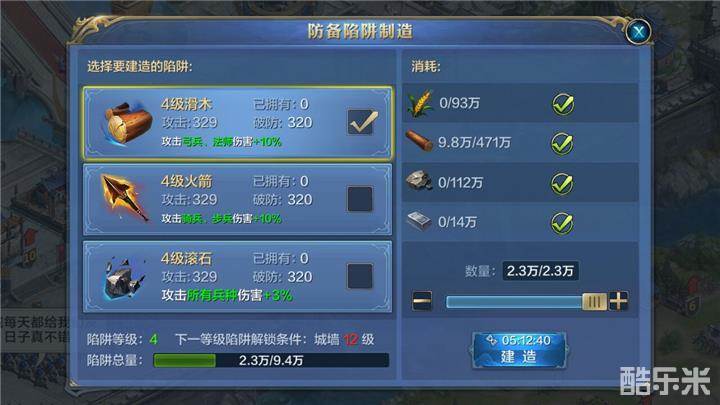 虽然从面板上的攻击数据来看,4级滚石陷阱的攻击力和24级的橙色一阶英雄赵云差不多,但是陷阱的攻击力很大程度上也受限于陷阱的数量。同时陷阱制造的时间比较久,如果连日战争的话,陷阱的补充很有可能就会跟不上节奏,相对于英雄和士兵只需要消耗材料就可以迅速补充的情况来说,陷阱在城防战争中的作用也只能限于辅助。但是,从城防战的全局战况来看,每一次的城防,敌人总是先进攻城墙和陷阱,当城墙和陷阱失去作用之后,才是士兵间的短兵相接,所以城防牢固与否,决定着后期部队作战能否占据先机,如果城防能够起到很好的消磨敌方兵力的作用,则后期的战事就可以相对的更轻松一些,所以诸位主君可千万不要忽略城防的重要性。