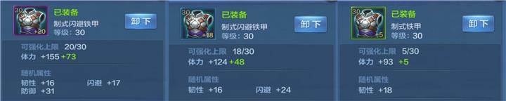 由于装备资源和强化资源有限,主君在装备分配上,需要根据英雄特点来分配,例如,护甲的随机属性为韧性、闪避、防御三项,偏重防御,所以可以将高品阶的护甲优先分配给前排角色如步兵、骑兵,减少其对位到弓兵时受到的暴击伤害,同时增加生存能力。