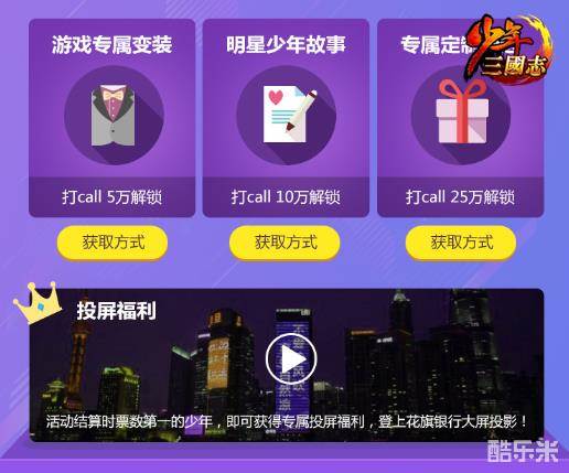 《少年三国志》616少年节自去年上线以来,便与亿万玩家共同开启狂欢。如今,《少年三国志》通过上海外滩地标建筑的大屏幕,宣告今年616少年节即将来临,并邀请秦奋、韩宇等明星加入热血少年团,同少年们一起狂欢。而这些明星玩家身上所具有的独特魅力,如“不羁”、“勤奋”、“元气”、“执着”等,正契合了《少年三国志》所主张的少年精神。