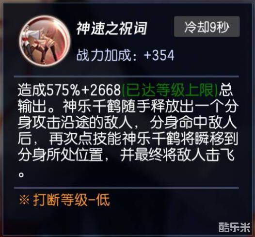 神乐千鹤的1技能神速之祝词是属于一个远程攻击外加位移特性的技能,这个技能不但让神乐千鹤拥有一定的攻击范围,更重要的是能够在命中对手的时候瞬移到敌人身旁进行连招。