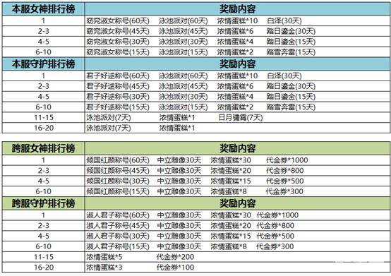 4、本服前10名女神将进阶跨服决赛(分QQ/微信两大战区)本服、跨服前十大女神都将获得丰厚奖励道具。本服、跨服前二十大守护者也同时获得丰厚奖励。