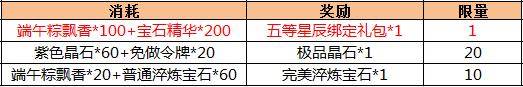活动内容:活动期间累积消耗达到相应的额度,即可通过【活动】-【端午消耗礼】领取相应奖励,具体累积消耗额度与奖励如下: