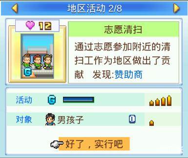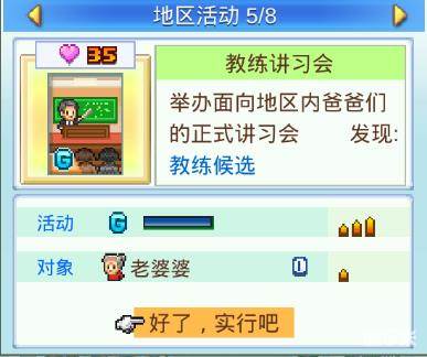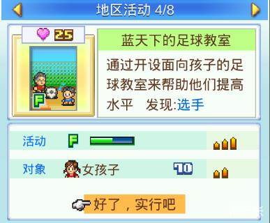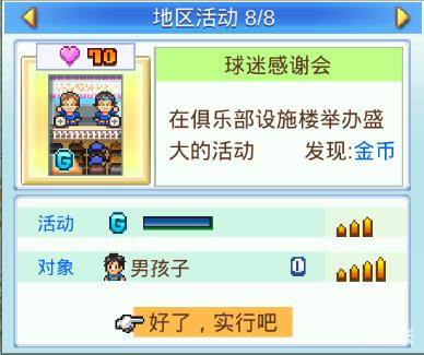 在没有比赛的时间里积极进行地区活动可以为球队赚取大量的利益,与教练训练或者特训不同的是,进行地区活动不需要球员消耗体能,所以多举办地区活动不失为提升球队实力的一条捷径。