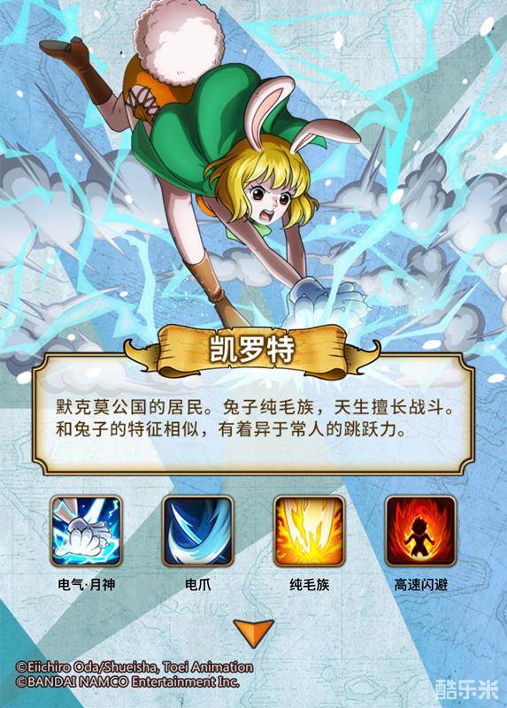 在动漫佐乌篇中登场的凯罗特有着不俗的战斗力,作为纯毛族,凯罗特可以使用摩擦生电来攻击敌人,同时还有敏捷的身手和强大的跳跃能力。本次凯罗特将作为SS级人物在《航海王启航》中登场,同时,一大波端午节福利也将登陆,船长们一定要重点关注哦~