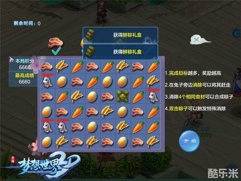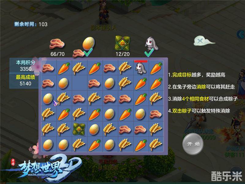 通过移动活动界面的各种食材,少侠可以尽情享受三消快感,完成目标越多,奖励也会更加丰富!值得注意的是,假如同时消除4个相同食材,即可成功合成粽子,而双击粽子还可以触发特殊消除,快速大量消除全靠它!活动过程中捣蛋的小兔子也来凑热闹,无需担心它偷吃食材,只要在它旁边成功消除就可以将其赶走。让人上瘾、消除根本停不下来的端午活动,唯有眼疾手快、反应灵敏才能获得更多端午奖励!