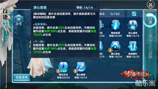 15级技能效果:提升自身25%生命回复效率,天舞宝轮额外回复体质*89%点生命,慈航普度额外回复体质*270%点生命。