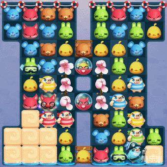 2、棋盘的左下和右下有一些奶油,不及时消除会将旁边的棋子,变成新的奶油。而棋盘中间有两个万能孵化蛋,可以孵化出旋风小丑,但其左右有樱花阻碍。所以这些障碍物都是我们必须消除的目标,我们在匹配水手猪的同时,还需尽量寻找机会消除这些障碍物。