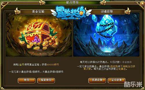 4399冒险契约的黄金宝箱全新改版变成皓月贸易啦,除了以往刷银币的功能外,还增加刷灵魂点功能,为各位想尽快进行战神幻化的勇士们提供便捷的途径!