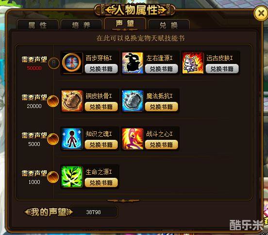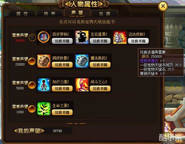 兑换需要银币、宠物灵魂石、天赋书残页、天赋石、天赋卡,随着声望等级越高,需要的东西也越来越多,这些东西大部分都在宠物副本产出。所以,即使声望暂时达不到,每天刷够3次宠物副本,攒够足够的材料还是很有必要的!