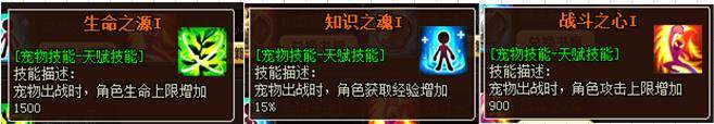这只是声望第1级和第2级对应的最初级的三本天赋技能书,数值就已经如此给力,后面更高级的可想而知。必须注意的是,同一只宠物同时只能学习一个天赋技能,后面学习的会替换前面的,所以在选择天赋技能书时一定要慎重!是加经验,还是加攻击力,还是防御力?全看你的理解。并且,天赋技能不能跳级学习,例如要学习二级的生命之源,宠物首先要学会一级的生命之源。