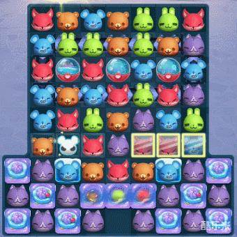 1、本关并不掉落紫色棋子,想要收集任务所需的紫色棋子,必须先攻击棋盘中的3个万能孵化蛋,孵化紫色棋子到棋盘上,再进行收集。三个万能孵化蛋的周围有一圈传送带,传送带上的棋子会随步数消耗,每步随传送带指向逆时针移动一格,匹配攻击万能孵化蛋的机会非常多。所以我们开局直接寻找机会,就近匹配棋子来攻击万能孵化蛋。