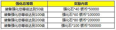 活动内容:活动期间内,玩家装备强化总等级满足要求后即可获得奖励,每档奖励仅可领取一次。