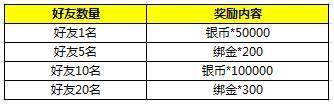 活动内容:活动期间内,玩家好友数量满足要求后即可领取奖励,每档奖励仅可领取一次。