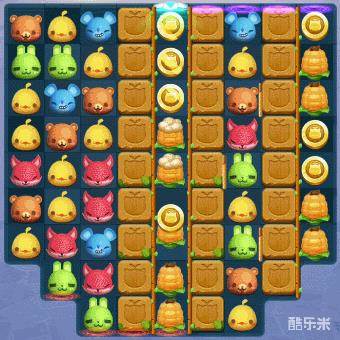 1、本关需要收集的玉米,只会在棋盘中间列的掉落阀门处掉落。不过掉落阀门处并不是只掉落玉米,还会掉落金币,所以我们需要将金币消除,才能更好的收集玉米。而掉落阀门所在列的左右,有栅栏和木箱联手阻碍,我们必须消除木箱,才能在其左右列匹配棋子,来消除阻碍我们收集玉米的金币。