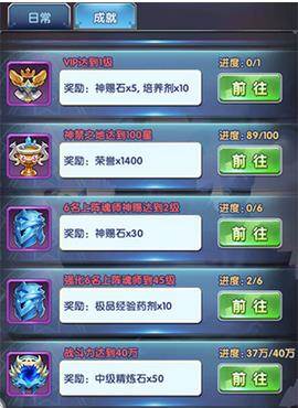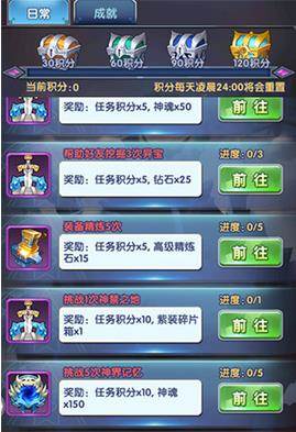 任务里面主要分日常和成就,日常任务实际上就是各大玩法通关后的奖励,每完成一个就可以获得5-10的积分和材料奖励,积分达到一定的累积后,可以领取宝箱奖励,通常情况下前三个箱子都能够轻松领取,只要按照日常任务里面的去做就行了。