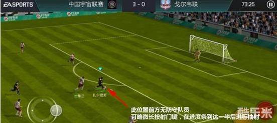 手势射门只要在屏幕上划出一道射门轨迹就可以。滑动的速度决定抽射的力度,我们可以看到抽射力度进度条,一般在一半左右是最好的。力度太大容易飞出去,太小会被守门员扑出来。