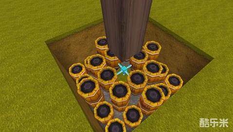 工具准备:树苗、肥料、铲子、开关、电能产生器、蓝色电能线、炸药桶、草块