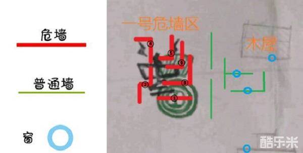 3号墙有拐角,而且有一面距离木屋比较近,所以我们可以在靠近木屋的方向打开一个窗户。这样3号墙就可以跟木屋联动,玩家甚至可以在1号-3号-木屋这种路线遛屠夫。