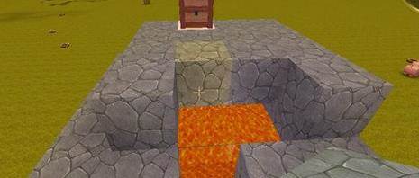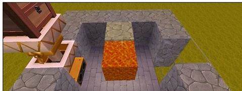 4.然后在第二格的正中间放一桶岩浆,先从边上加一块石头,然后让岩浆,接着再把石块敲掉就行。