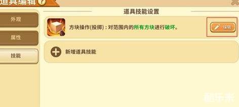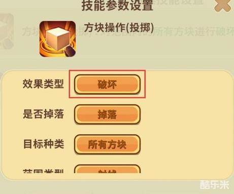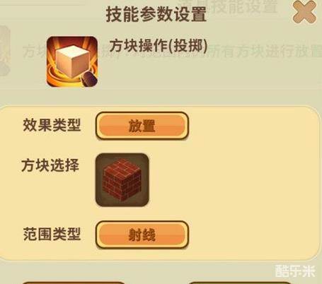 7、要把效果类型改成:放置。(大家可以在这里修改方块选择,改成你们想要的方块。还能修改射击出去的范围和距离等)