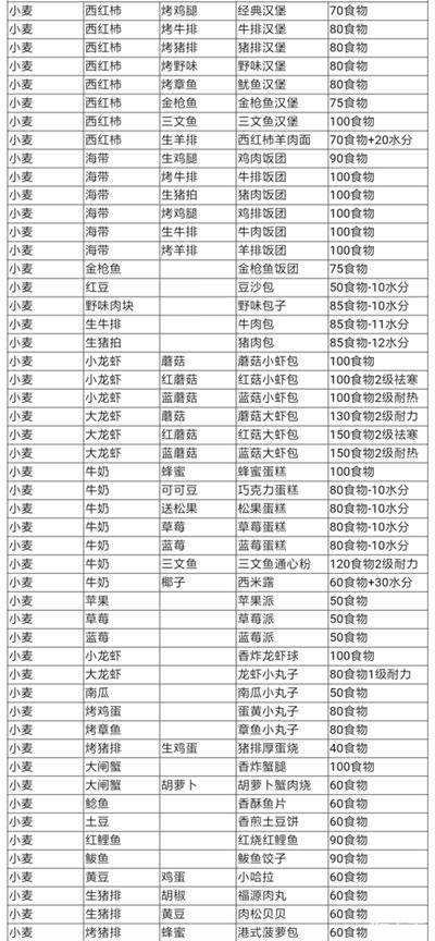 | 烹饪食材 | 胡萝卜+生羊排=羊排汤(回复65食物、30水分) 胡萝卜+生鸡蛋=胡萝卜炒蛋(回复75食物) 胡萝卜+象拔蛤+海带=翻水象拔蛤(回复120食物、60水分) 胡萝卜+大闸蟹+小麦=胡萝卜蟹肉烧(回复60食物) 胡萝卜+菠菜+海带=晨夕养生汤(回复60食物) 胡萝卜+玉米+河豚=什锦河豚豆丁(回复60食物) |