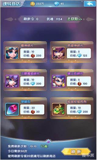 魂导商店:魂导商店里会出售强力魂师的碎片,并有可能出售整张魂师卡。