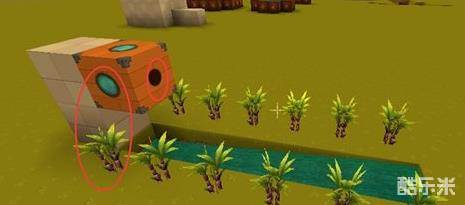 2.在水流流向的一侧,如下图所示,在第一个甘蔗的那一排放一个感应方块,注意按照图中所示的位置摆放,电流输出口朝着水坑;
