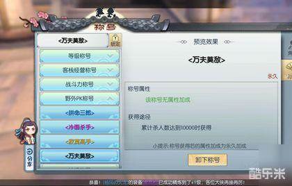 在武林外传手游中许多称号可以供玩家展示,而万夫莫敌就是其中之一的黑色称号,小编表示十分炫酷,这个称号需要杀人累积到一定次数才能获得,那么下面就由小编来为大家详细讲解下万夫莫敌称号的获取方式吧~~~