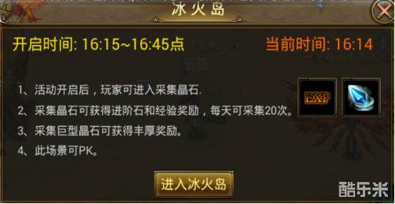 冰火岛乃《烈火屠龙》的特色活动之一,活动时间为每天16:15-16:45,冰火岛开启时,系统会弹出提示,玩家可点击提示[进入冰火岛]。