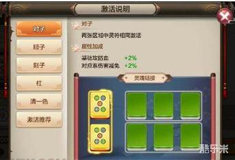 刻子:当三张灵符区域灵符相同时,则激活刻子加成。激活后召唤师可获得基础攻防血+4%以及对应系伤害减免+4%。