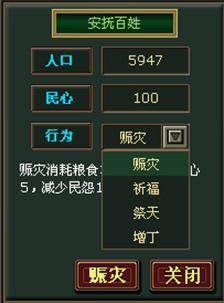 祭天:通过同时支付粮食和黄金来避免一次天灾,和一定几率增加一次天赐。支付黄金和粮食的数量跟城市人口数量成正比。