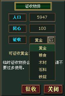 您也可以对百姓进行征收物资,结果是获得一定的资源但民心大降。在一些特定的危急时刻,为了进行关键性战略布署,这样的手段是不可避免的,但要牢记当时局转安时要努力安抚您的人民。可征收的物资有黄金、粮食、木材、石料、铁锭,征收物资的数量和城市人口数量成正比。同时征收物资将会一次性降低民心20,民心低于20则无法征收物资。