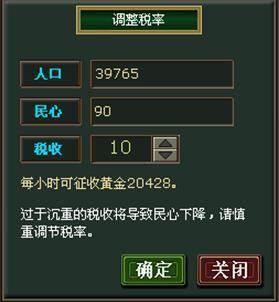 调高税率可以为您的城池发展提供更多的建设资金,但是横征暴敛虽能带来一时的物资,最终却会导致严重的后果。所以做为一名开明的君主一定要控制好税率,将民心控制在稳定的范围内。税率过高,民心会下降,从而会导致人民自动流失和逃跑,也会影响军队的发展和作战能力。
