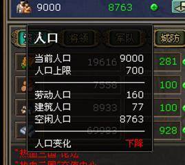人口是城池发展非常重要的数值,资源生产和军队发展都需要人口的支持。要获得黄金,就要征税,征税的基础也是人口。在游戏界面的左侧栏可以看到两个与人口相关的数值:城池人口和空闲人口。