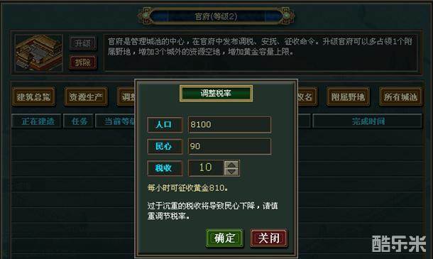 在城内界面点击“官府”,弹出官府面板,可以进行税率管理。