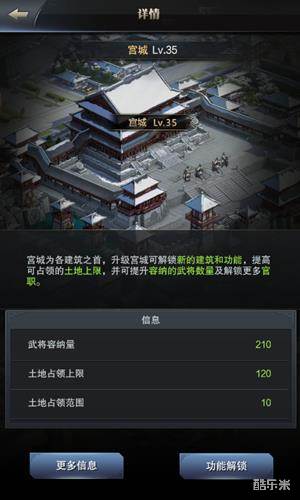 在各位主公的霸业征途中,总是会不断实现一个又一个的小目标来逐渐提升自身实力。在本次新资料片中,宫城等级上限将开放达到35级。随着宫城等级从30级上升到35级,可以逐渐解锁新科技,以及更高级的强化兵种哦!例如宫城达到35级以后,步兵新增神剑卫,骑兵新增天骑兵,弓兵新增连珠箭士,战车新增神机炮。众多强化兵种全力出击,定能为主公们霸业征途扫平一切障碍!