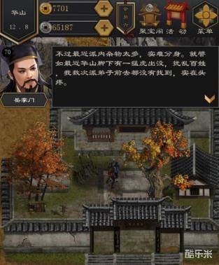 等邀请完各大掌门后,向平王汇报,等待武林大会召开,需要等待5分钟,到长安(62,33)出,开启武林大会,先跟铁铮比试(63,35),输掉了,貌似也没啥,人家平王才是大角,获得了胜利,魔教教主任教主前来过招,岳掌门和何掌门身受重伤,在平王府养伤,让你把赛华佗请来,赛华佗治不了,还得请羊州的平一手,到羊州六分半堂门口的王大锤(8,10)打听,再到金风细雨楼门前(21,8),会被许清愁拦住,执意要进发生打斗,